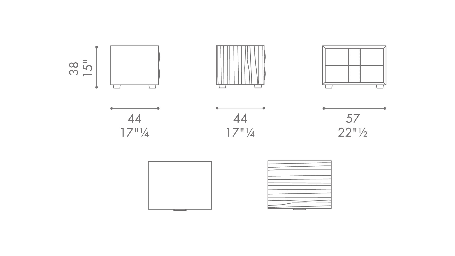 La cassettiera, i comodini Obi hanno cassetti montati su guide metalliche con chiusura ammortizzata. Il frontale dei cassetti e le maniglie sono interamente rivestiti in Pelle Frau®. Disponibile in legno, con impiallacciatura in tranciato di noce Bruno.